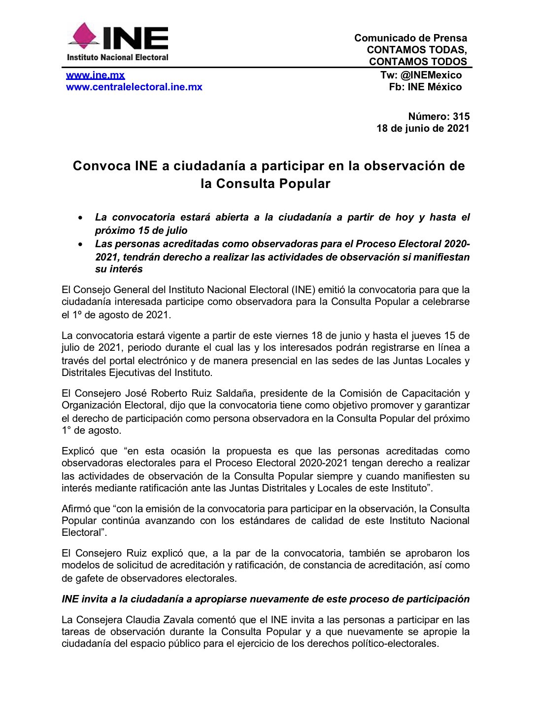 Mar 08, 2010 · por qué sí a la consulta consulta popular. "aunque por decisión del congreso de la unión, la convocatoria que aprobaron ambas cámaras entra en vigor hasta el 15 de julio del 2021 y por lo tanto antes de esa fecha no podemos iniciar formalmente la difusión de la consulta, el ine ya comenzó con los preparativos para hacerla posible, para ello hemos habilitado el sitio ine.mx.